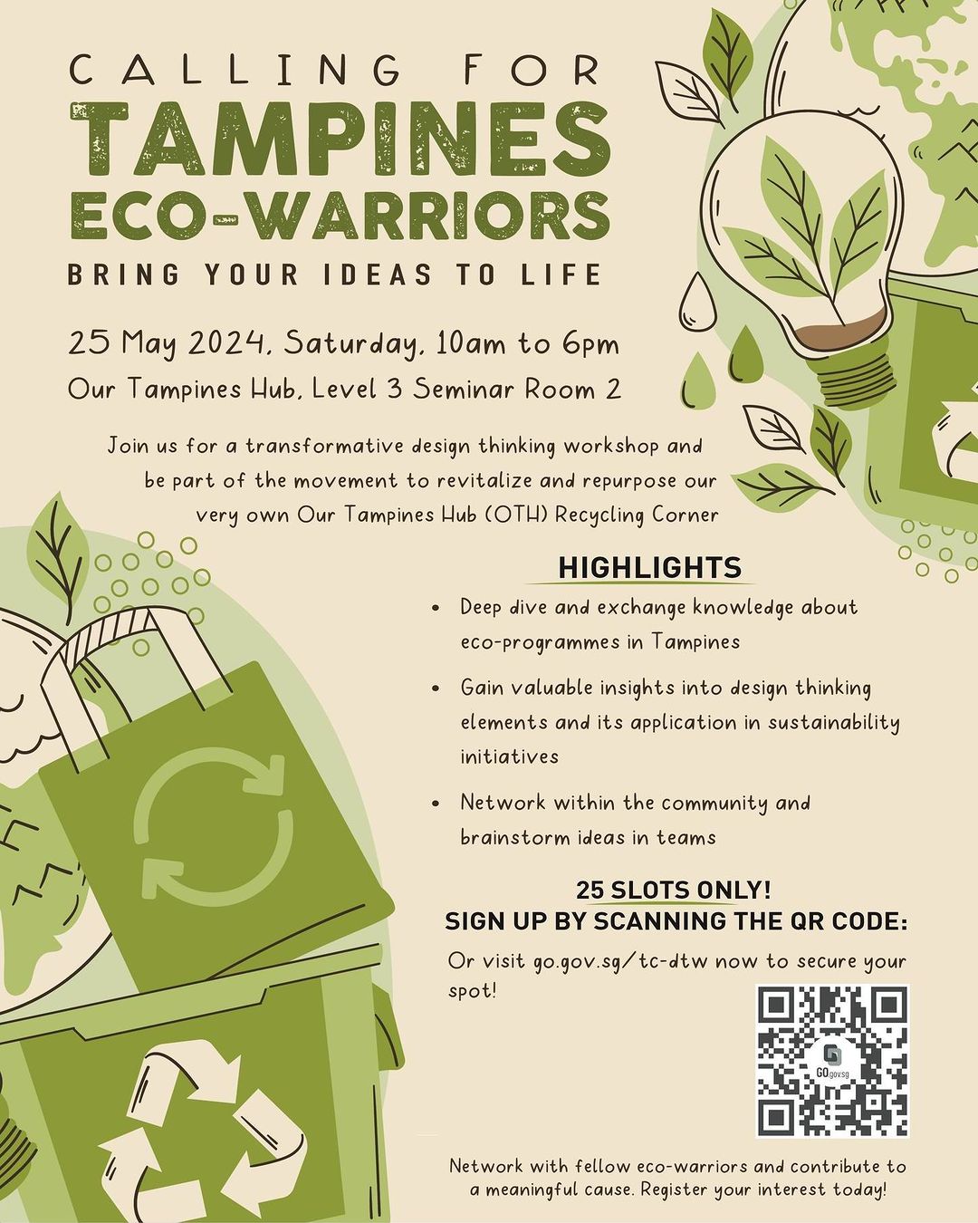 Calling all Eco-Warriors in Tampines! Bring your ideas to life and get ready for an enriching experience! Immerse yourself in a workshop to dive deep and exchange knowledge about eco-programmes in Tampines! Join now @ https://go.gov.sg/tc-dtw