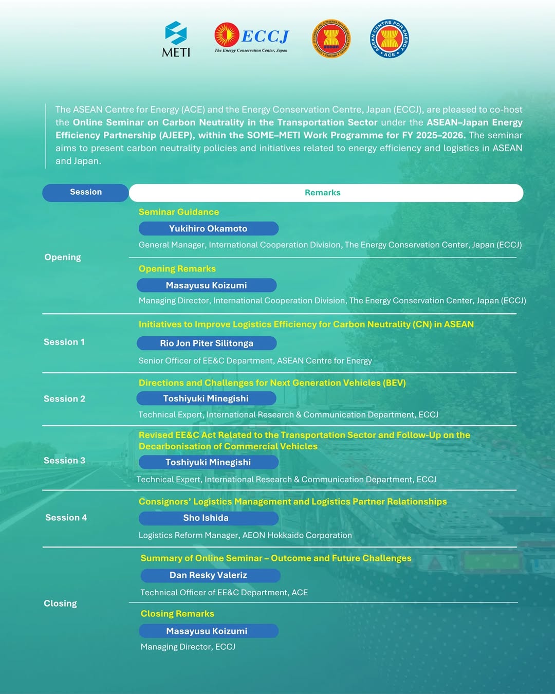 The ASEAN Centre for Energy (ACE), together with the Energy Conservation Center, Japan (ECCJ) are hosting an online seminar for carbon neutrality (CN) in transportation sector as part of the AJEEP programme. The online seminar aims to present CN’s policies and initiatives on energy efficiency and logistics within ASEAN and Japan, with a particular focus on the transportation and logistics sectors. It will further highlight recent developments concerning the Revised EESC Act, the decarbonisation of commercial Vehicles, and approaches to logistics management and partnership.
