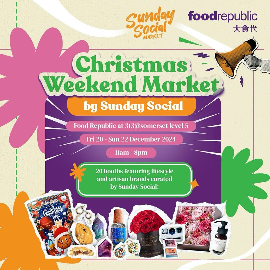 Join us at the Weekend Christmas Market by Sunday Social on from Friday 20 to Sunday 22 Dec at 313@somerset! We’re bringing our signature blend of culture, community, and local talent to celebrate the grand opening of the newly revamped Food Republic food court, Expect a festive shopping experience where over 20 local artisans showcase a curated selection of unique gifts, from handcrafted accessories to home decor and wellness products. Explore this vibrant space inspired by the Weekend Market, with an exciting variety of flavors from Mini Restaurants and Stalls serving both local and international delicacies, Bring friends and family to enjoy festive activities, delicious food, and a lively atmosphere that’s perfect for some holiday cheer. Shop, eat, and mingle in a space designed to inspire connection and celebration. Let’s make this a Christmas Market to remember! @foodrepublicsg @313somerset