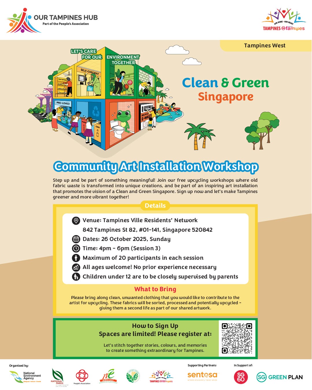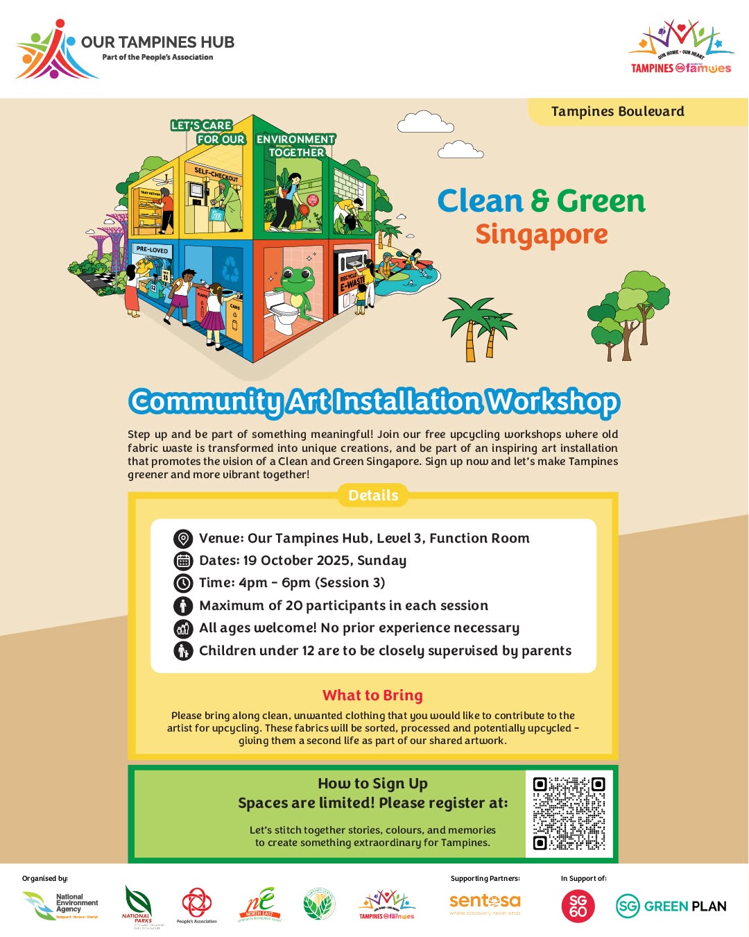Represent your division’s wishes for a Clean & Green Singapore through an inspiring community art installation, to mark SG60! Join Our FREE hands-on Fabric Upcycling Workshop, where you can learn how to turn old textiles into a beautiful collage.