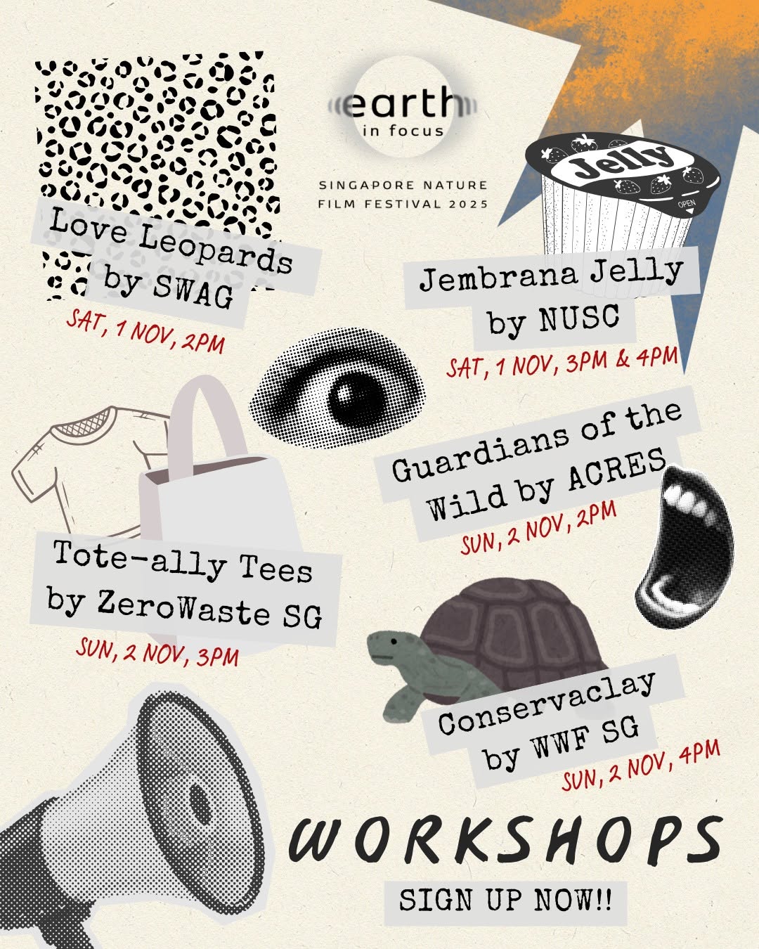 From chasing down wildlife traffickers with @eyesofacres to wildcat experiences with@swag.cat.sg Try your hands at crafting clay animals with @wwfsg and give your t-shirts a new lease of life with @zerowastesingapore Travel with @nuscollege to the mangroves of Jembrana in Bali and learn how they derive delicious jelies from mangrove propagules!