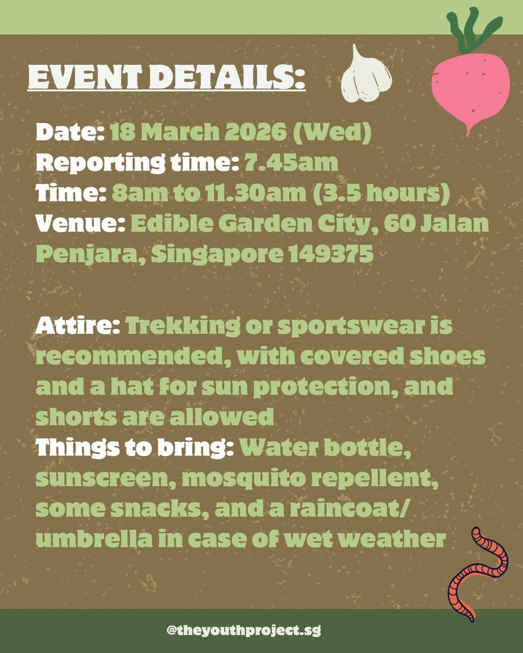 Bring: Water bottle, sunscreen, mosquito repellent, some snacks, and a raincoat or umbrella in case of wet weather, and of course your ENTHUSIASM!!🔥