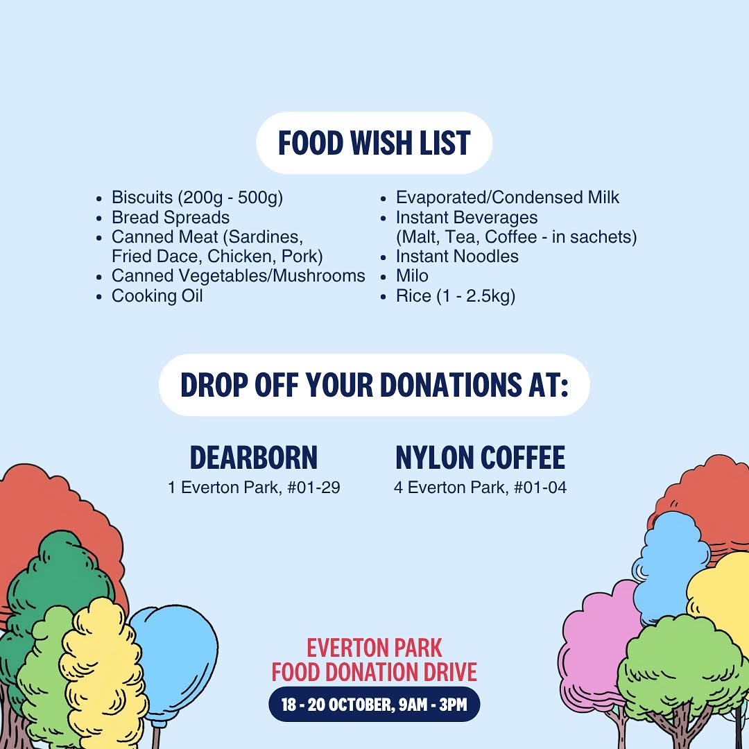 This year, October is extra special because @dearborn.granola, @rboulangerie, @morimoriyogashisg and @nyloncoffee are joining hands for an Everton Park Food Donation Drive for Food from the Heart