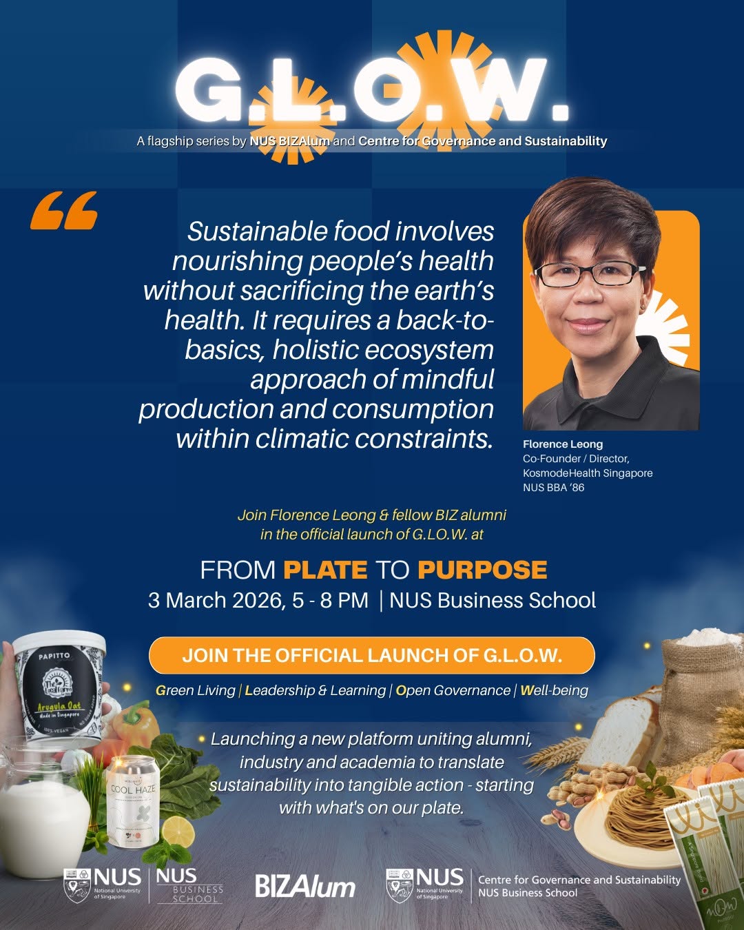 Join our launch, where Florence Leong and fellow BIZ alumni, Prof Lawrence Loh (Director, Centre for Governance and Sustainability (CGS), NUS BBA (Hons) ‘85) and Kenny Eng (Founder & Chief Farmer, The Local Farm, BSc Hons RE ’99) will discuss green living and sustainable choices. Network with professionals and students passionate about sustainability.