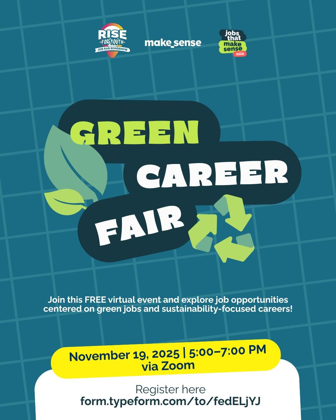 Join us at the Green Career Fair, a 2-hour virtual event designed to connect young Filipino job seekers with inclusive entry-level jobs and internship opportunities. In partnership with jobs that makesense Asia, this career fair shines a spotlight on green jobs — careers that support environmental sustainability and create lasting social impact.