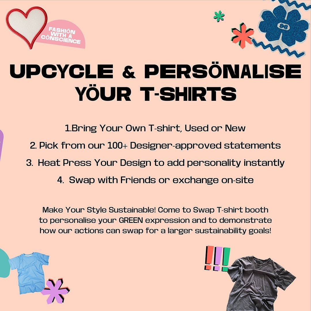 Make Your Style Sustainable! Come to Swap T-shirt booth to personalise your GREEN expression and to demonstrate how our actions can swap for a larger sustainability goals!