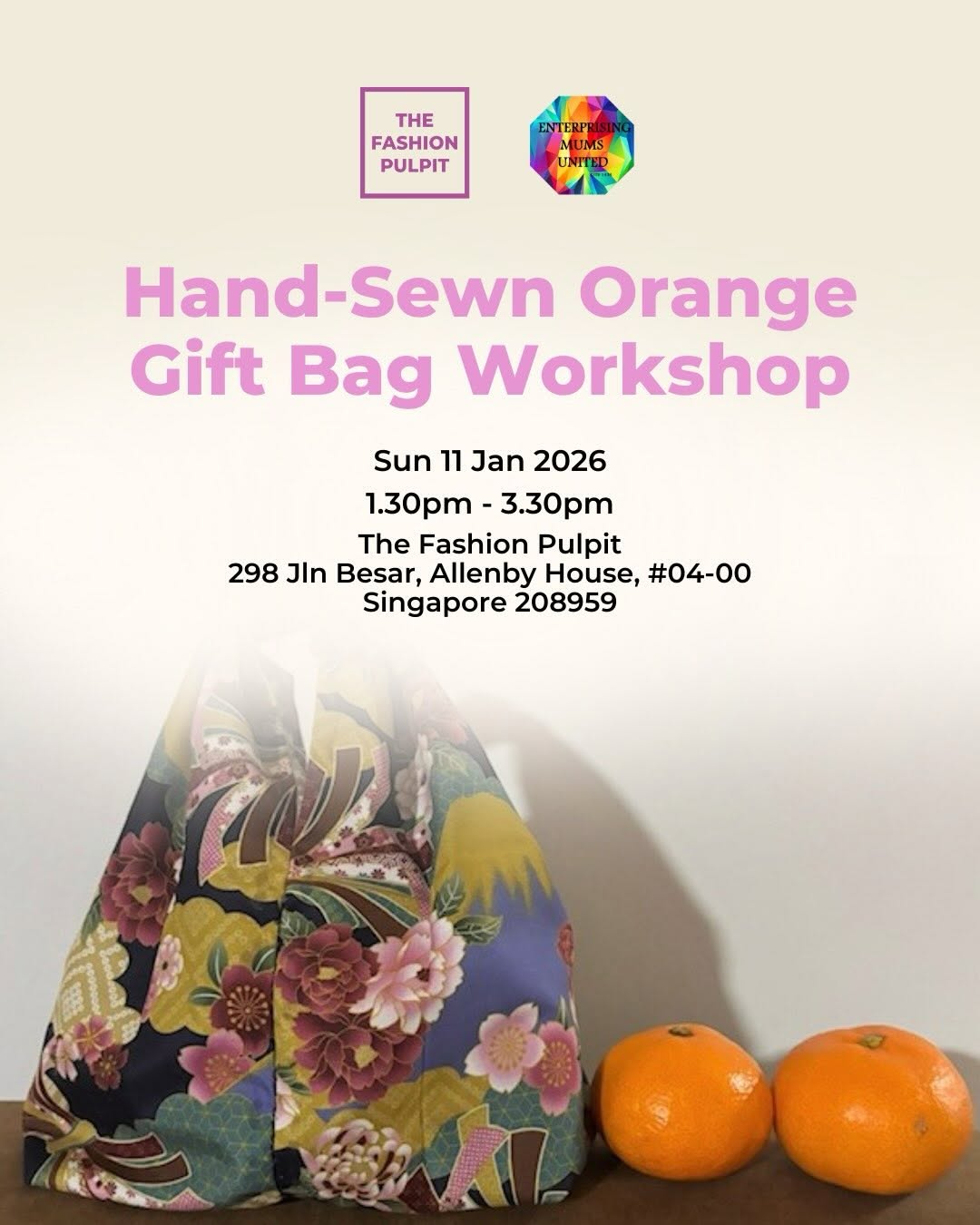 This hands-on workshop introduces participants to basic hand-sewing life skills through the creation of a reusable fabric orange bag, traditionally used for gifting mandarin oranges during Chinese New Year. Participants will learn essential hand-sewing techniques while gaining awareness of sustainable practices, transforming simple fabric into a meaningful, eco-friendly festive item.