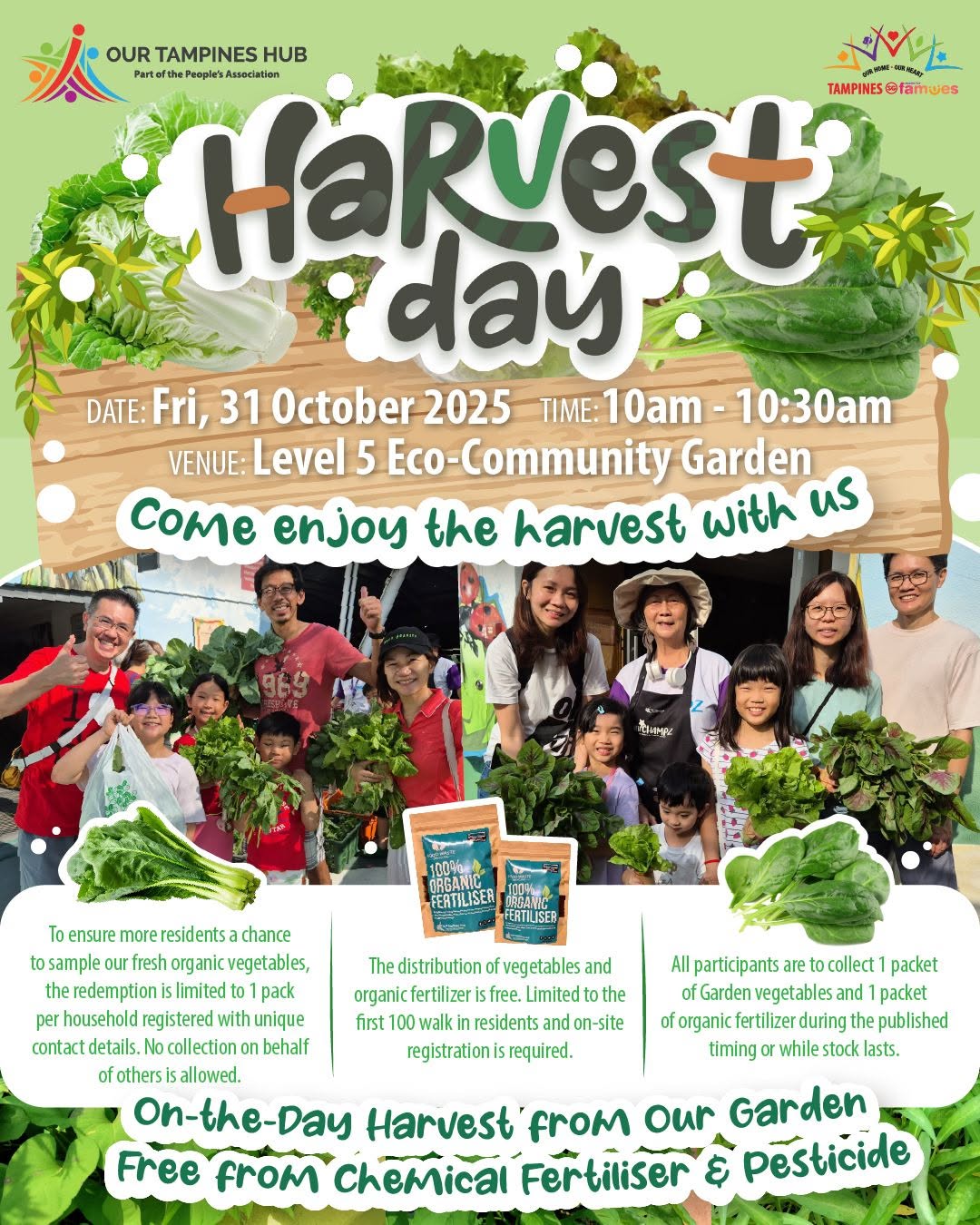 Collect 1 complimentary pack of organic veggies and organic fertiliser from the Eco-Community Garden at Level 5, Our Tampines Hub between 10am to 10.30am on 31 October 2025, Friday.