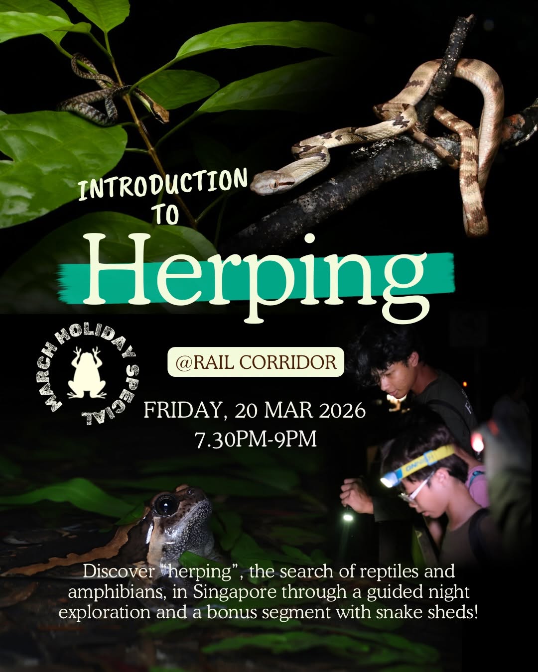 This March Holiday, discover “herping”, the search of reptiles and amphibians, in Singapore through a guided night exploration and a bonus segment with snake sheds!