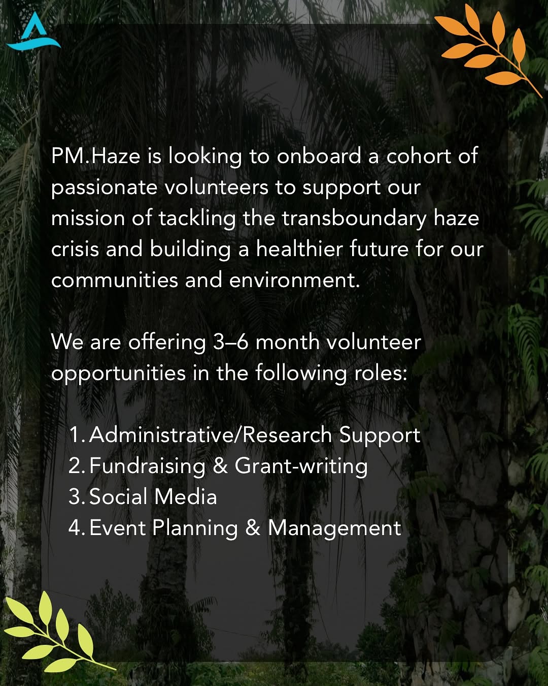 PM.Haze is looking to build a team of new volunteers to support our mission of tackling the transboundary haze crisis and building a healthier future for our communities and environment!