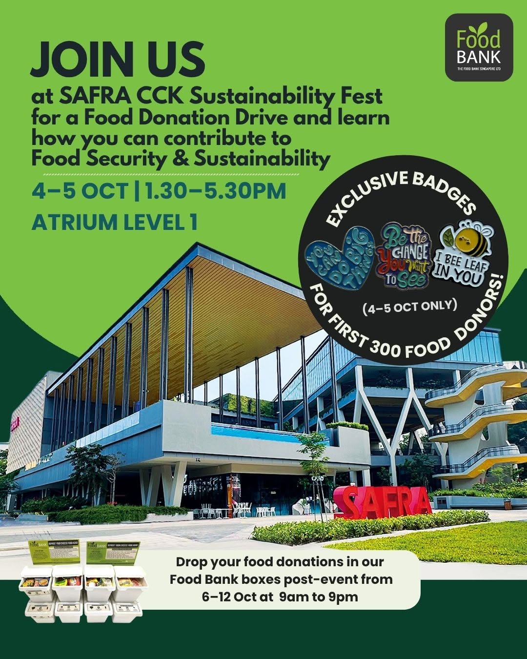 Can’t make it on 4-5 October? Don’t worry! Our Food Bank boxes will remain at SAFRA CCK from 6- 12 October (9am-9pm), so you can still drop off your contributions then.