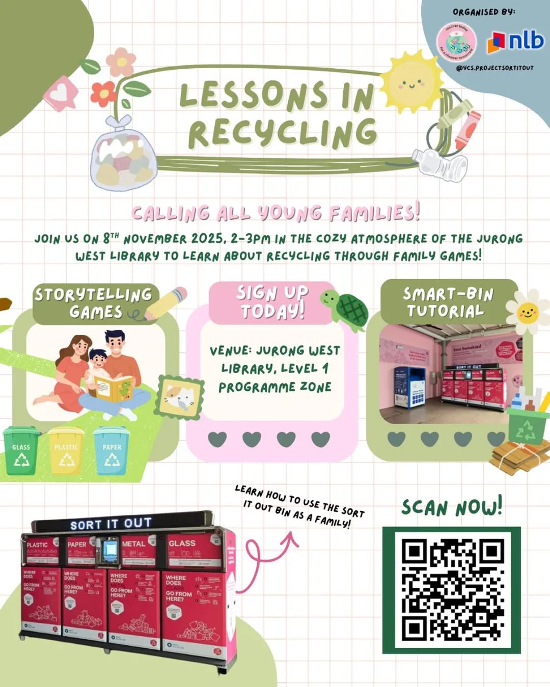 In collaboration with @nlbsingapore, Join us on 8 November 2025 (Sat), 2-3 PM at Jurong West Library . for an afternoon of games, stories, and hands-on learning about recycling!
