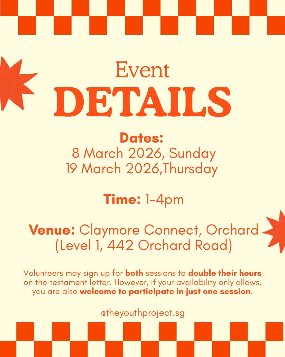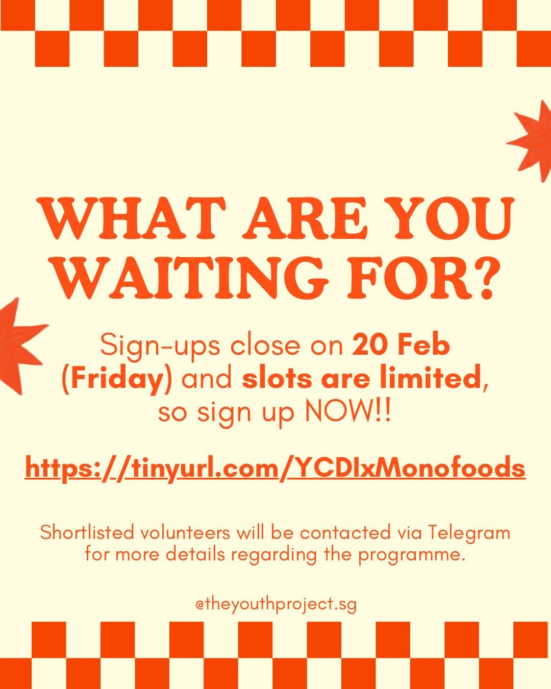 YCDI is supporting MonoFoods with their food donation drive, where volunteers get to pack food and educate members of the public on reducing food waste!🤤🤤 With a total of TWO sessions, volunteers can choose to participate in one or BOTH sessions!