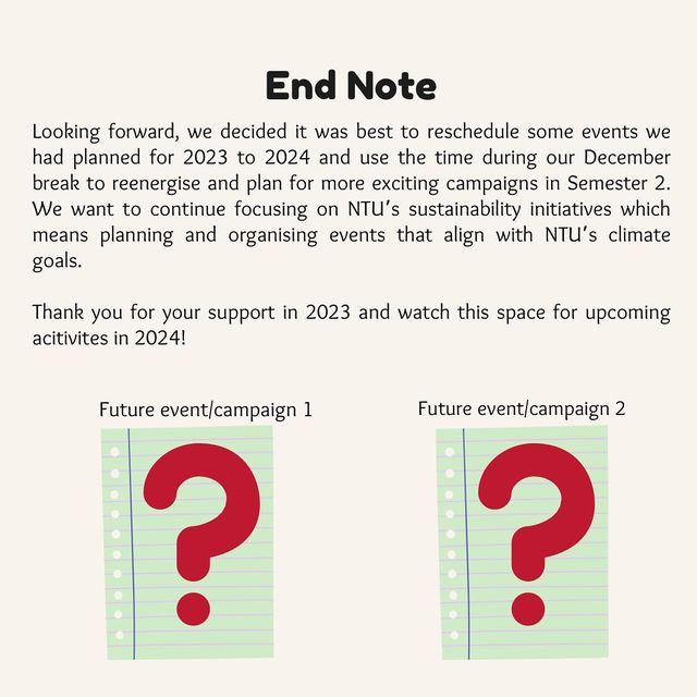 Structural angle/system focused: For example, in halls (more sustainability campaigns in halls, releasing an e-booklet as a guide to living sustainably in NTU halls), communications with NTUSU, school clubs/school offices (such as NTU Sustainability Office) etc., and connections with professors/researchers.