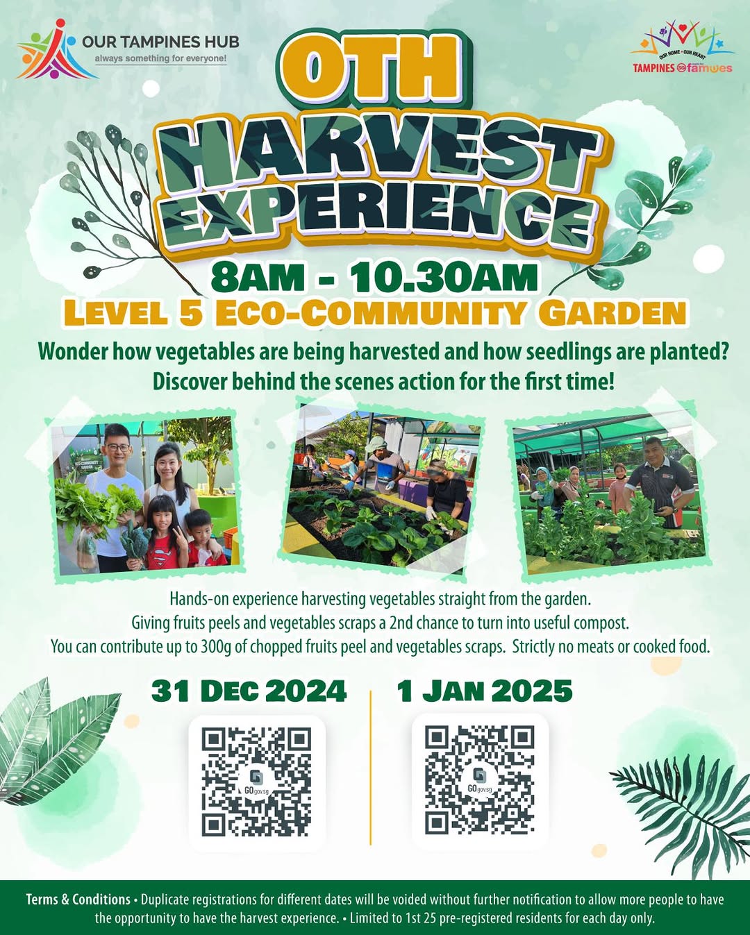 You can contribute up to 300g of chopped fruit peels and veggie scraps (no meat or cooked food) to the compost pile!