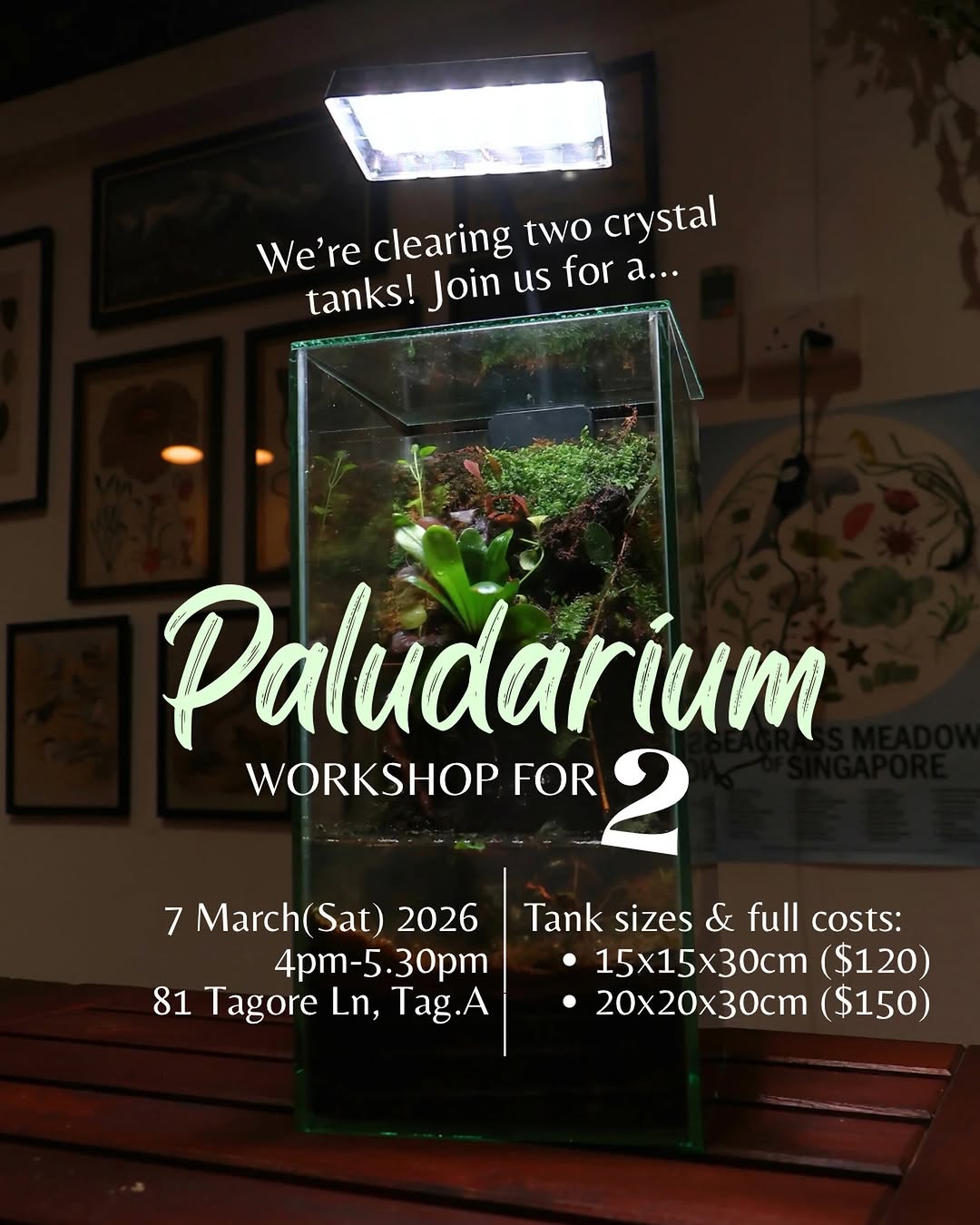 Hey! We’re clearing 2 CRYSTAL tanks of different sizes! Thinking of keeping a beautiful paludarium? Join our workshop for 2!