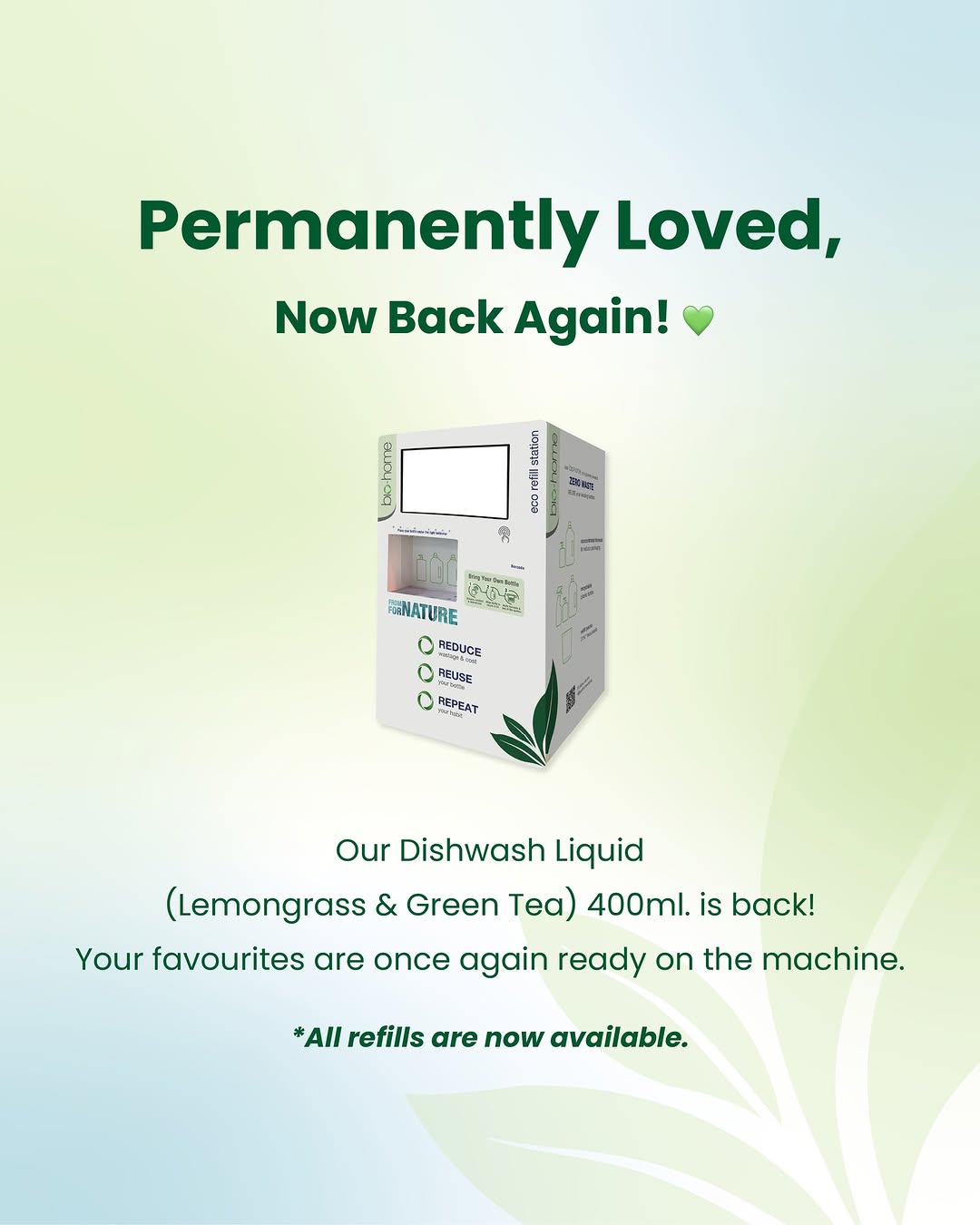 Your favourite Dishwash Liquid (Lemongrass & Green Tea) 400ml is ready to pour again at the ECO Refill Station.