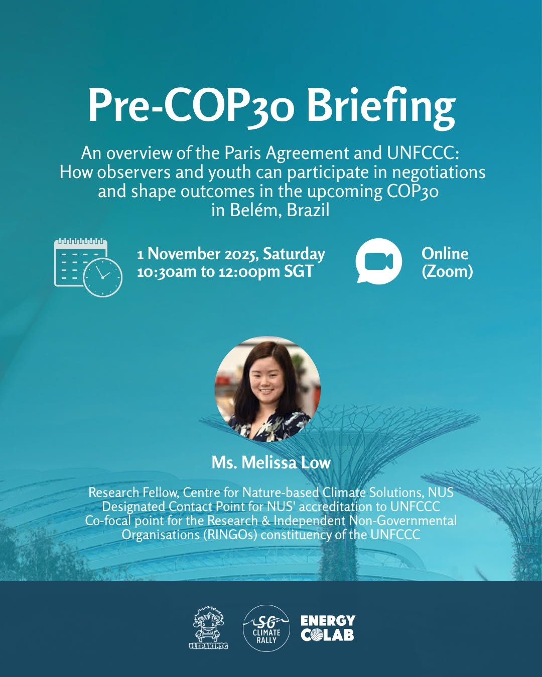 This webinar will be presented by Ms. Melissa Low, Research Fellow, Centre for Nature-based Climate Solutions, NUS. Melissa also serves as the Designated Contact Point for NUS accreditation with the UNFCCC, and is currently the co-focal point for the Research & Independent Non-Governmental Organisations (RINGOs) constituency of the UNFCCC.