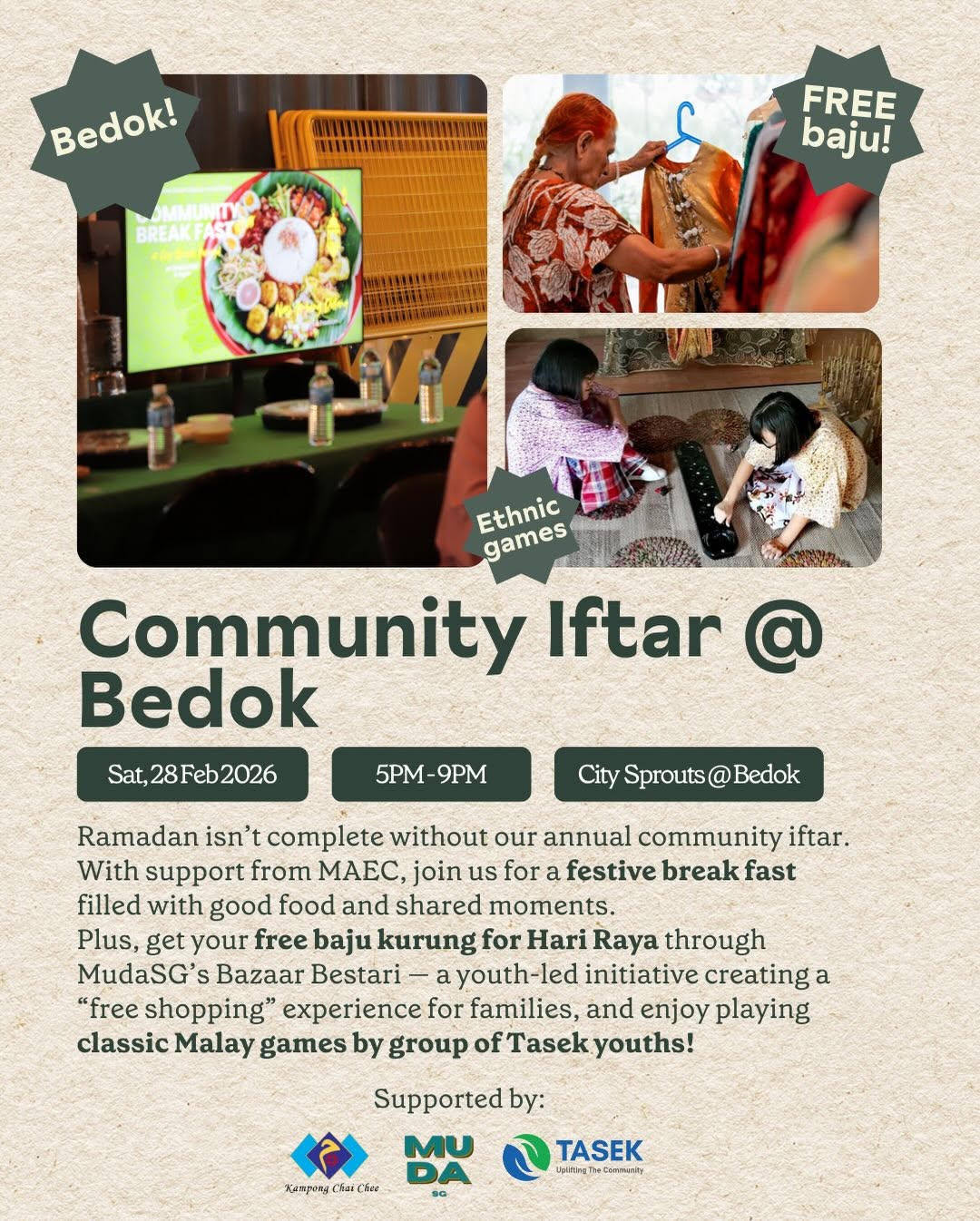 Community Iftar + MudaSG Bazaar Bestari + Classic Malay Games by Tasek— Break fast together, shop youth vendors, and play nostalgic kampung games.