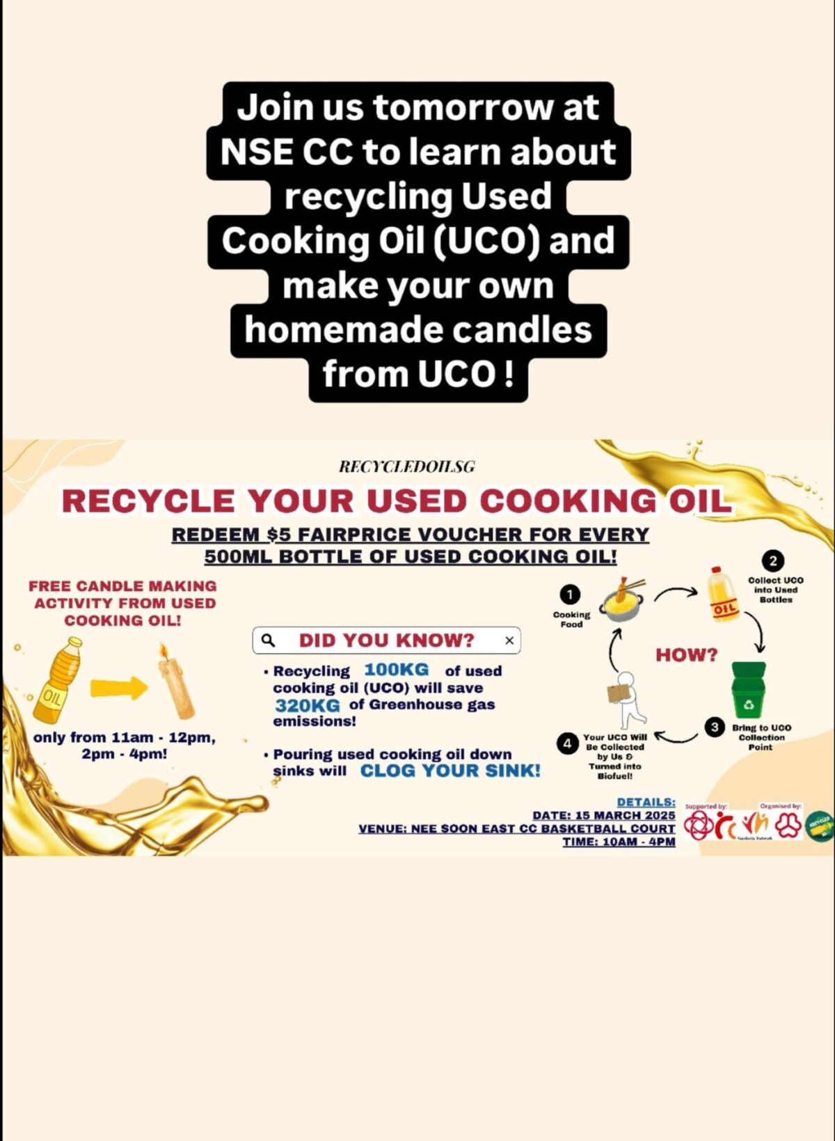 Join us tomorrow at NSE CC to learn about recycling used cooking oil (UCO) and make your own homemade candles from UCO!