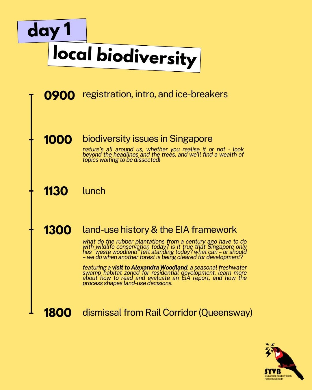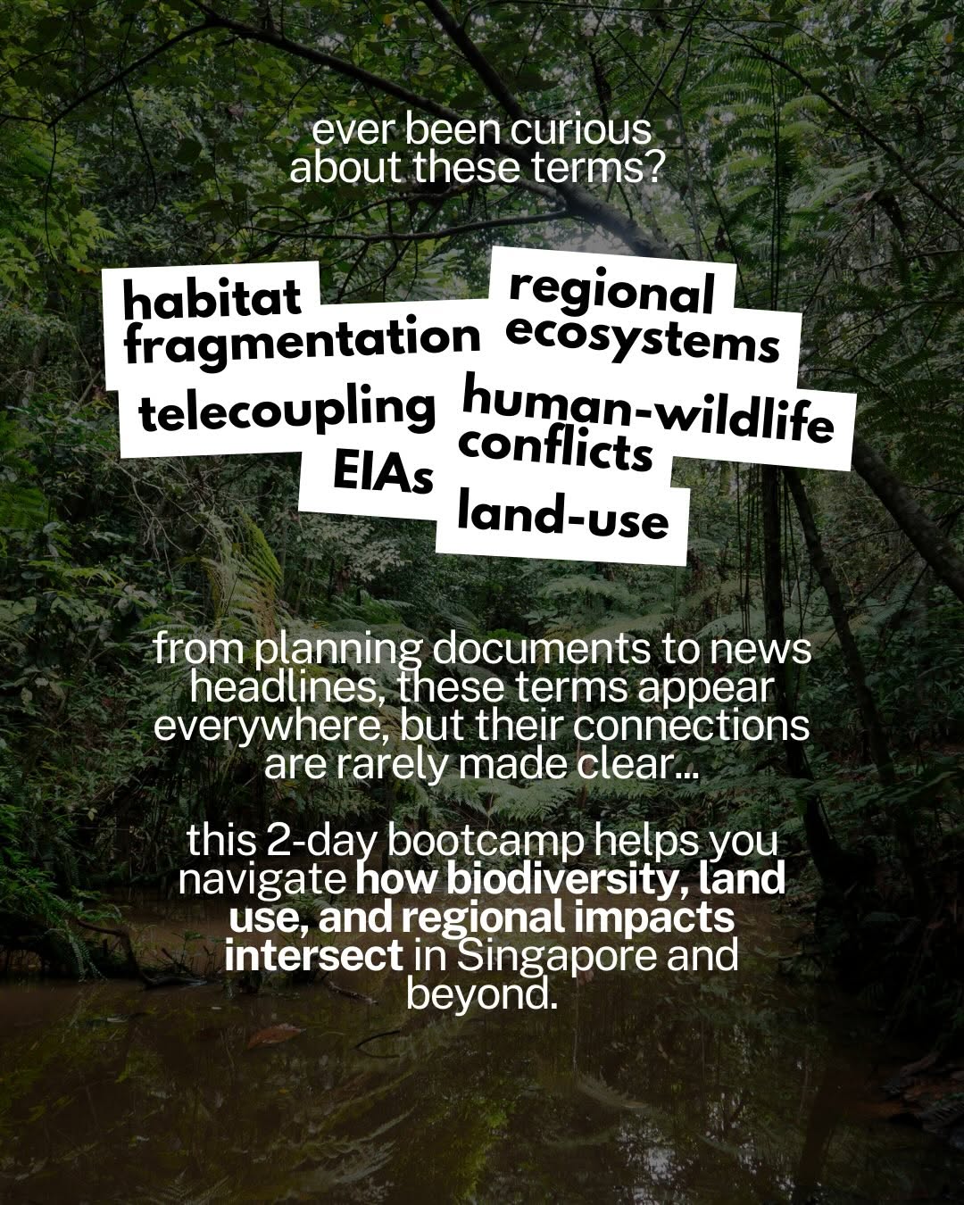 This 2-day day-camp takes a hard look at how biodiversity issues are managed in Singapore: the trade-offs behind land-use decisions, the assumptions baked into policy tools, and the ways science, economics, and public sentiment intersect.