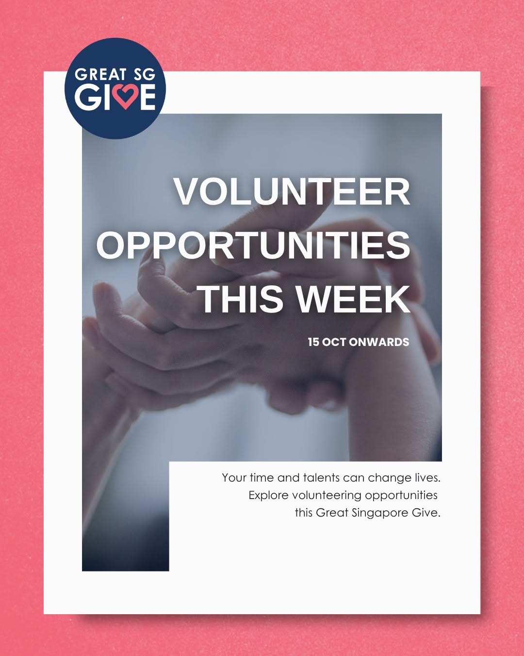 Here are the volunteering opportunities under the Great Singapore Give happening over the next few weeks. From a few hours to a whole day, turn your time and talents into a real difference for someone else.