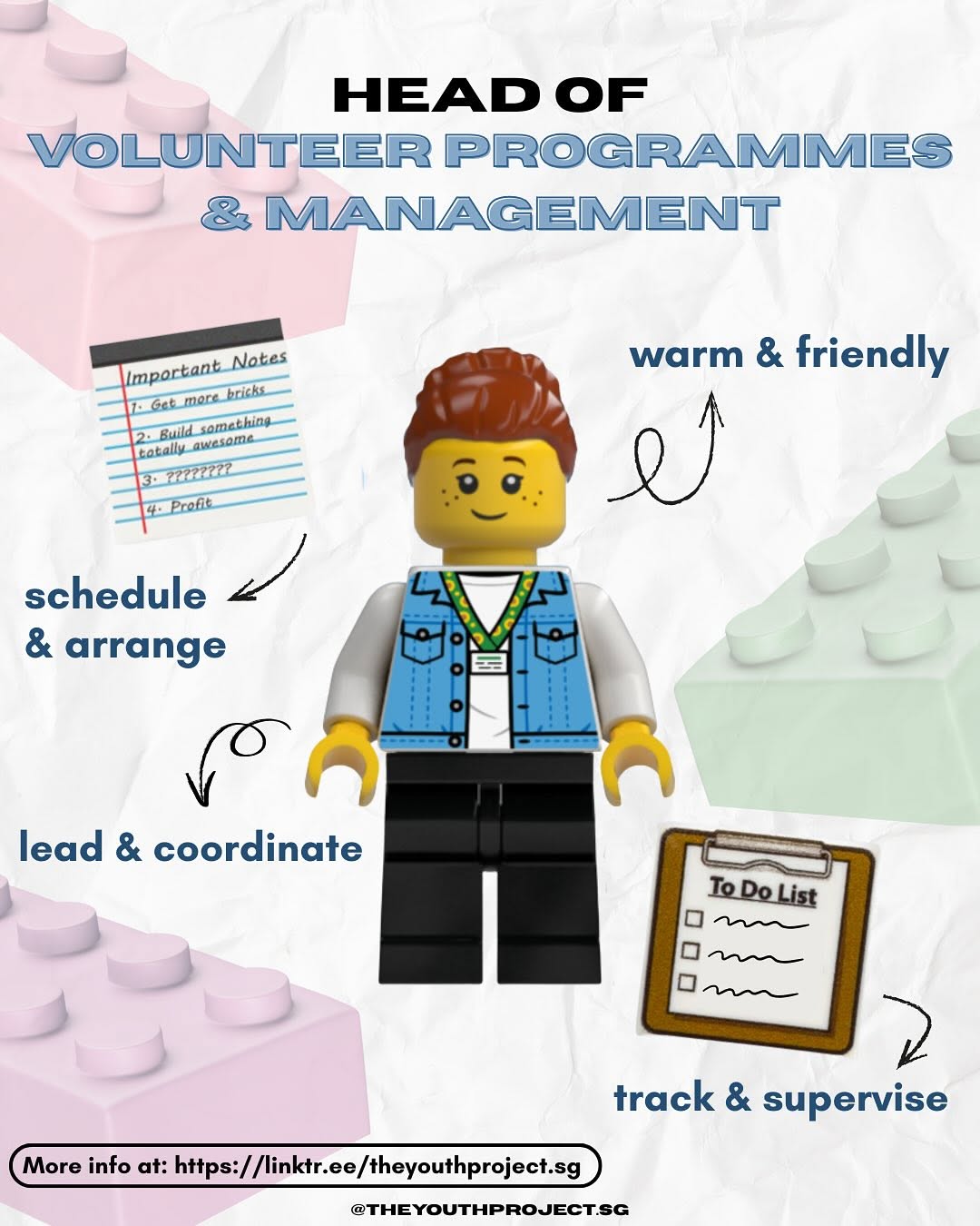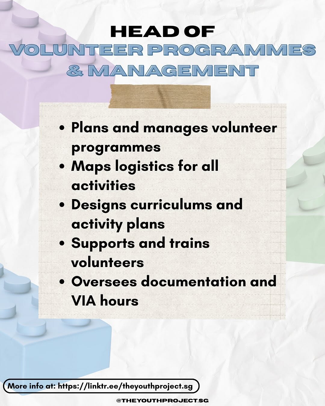 Look forward to overseeing the team, or planning programmes & events that give back to various communities Explore volunteer management and even designing new posts, merchandise or levelling our website!