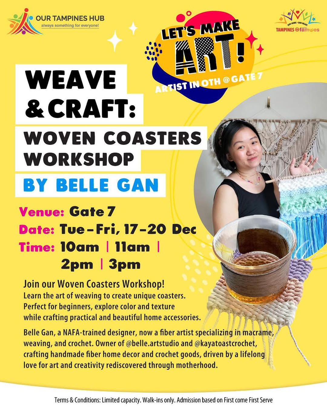Belle Gan, a NAFA-trained designer, now a fiber artist specializing in macrame, weaving, and crochet. Owner of @belle.artstudio and @kayatoastcrochet, crafting handmade fiber home decor and crochet goods, driven by a lifelong love for art and creativity rediscovered through motherhood.