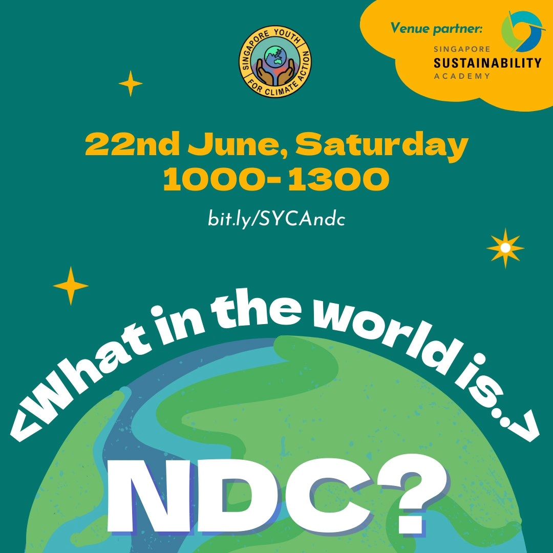< What in the world is… an NDC > SYCA is back with one of our flagship policy workshops! Join us on 22 June, Sat, for a deep dive into Nationally Determined Contributions. We’ll have an expert speaker presentation by Melissa Low, fun team challenges, and a friendly debate! (AND free refreshments