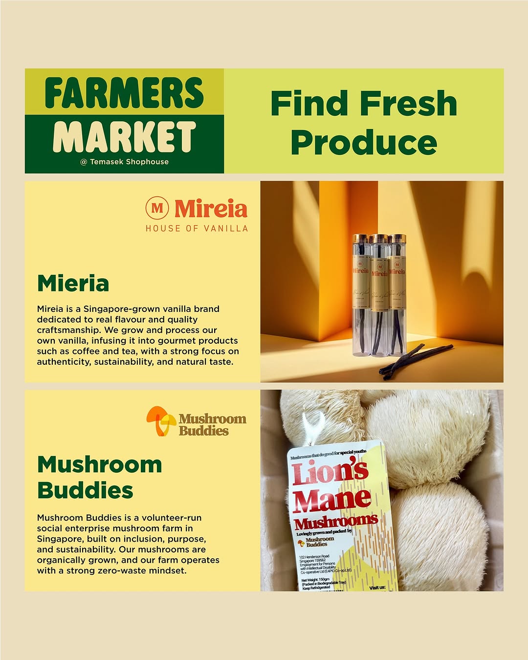 Fresh Produce: @afewgreenfarms | @artisan.green | Heirloom Garden | @hydrogreenssg | @mireiaforyou | @mushroombuddies_sg | @sg.farmersmarket | Wendy’s Kampong Garden by @wendycktan | @chitose_agriculture | @goldencapfarm